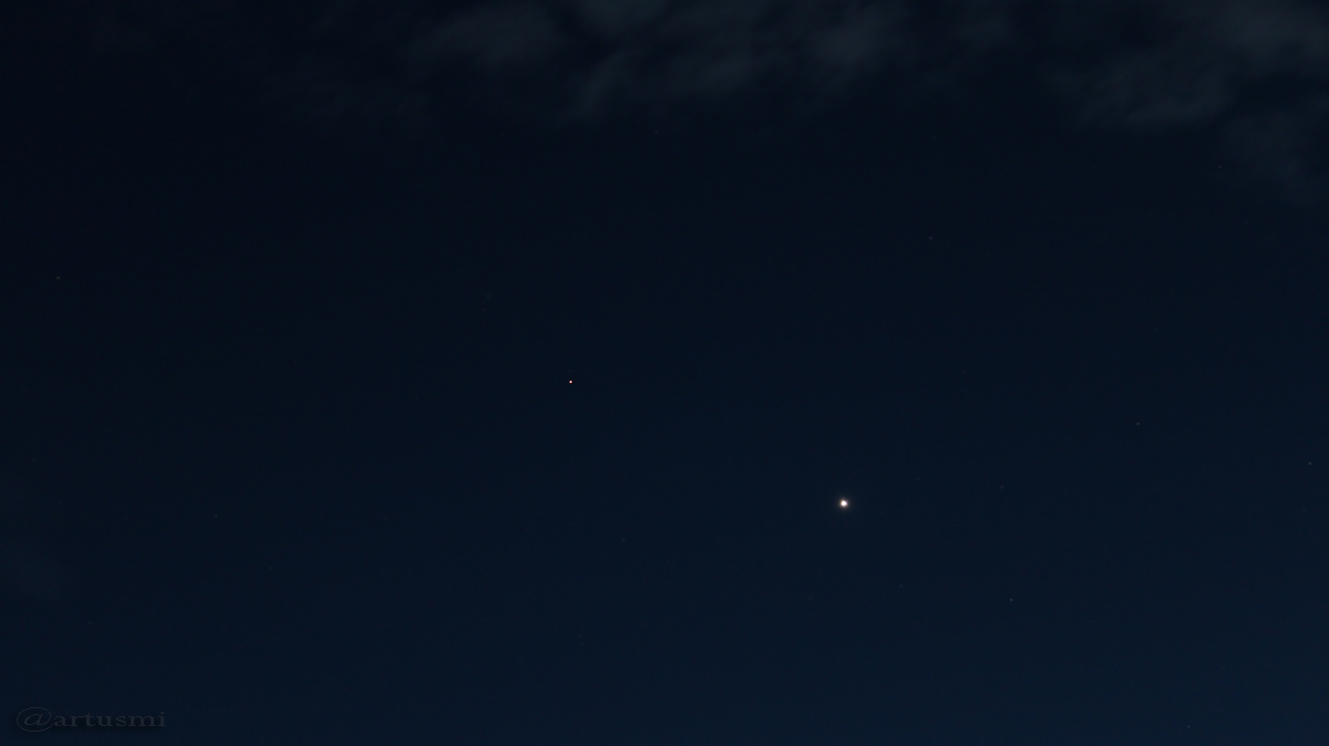 Die Planeten Mars (1,14 mag) und Venus (-4,6 mag) standen heute Abend in einem Abstand von knapp 5,5° zueinander im Sternbild Fische. Der um 18:26 Uhr zu 44,7% beleuchtete zunehmende Mond geht um 00:58 Uhr unter und zeigt sich morgen früh um 05:19 Uhr als Halbmond (unsichtbar an unserem Standort).
