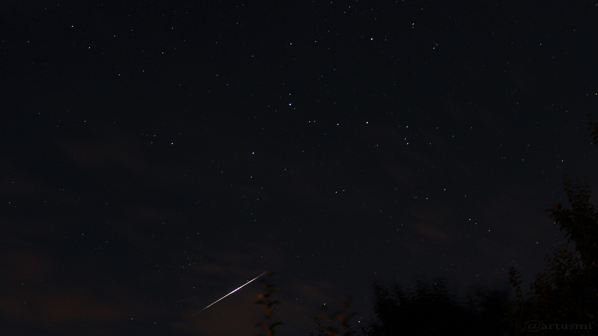 Das erste Flare haben wir einfach nur angeschaut. Für Fotos in Langzeitbelichtung war es noch zu hell. Auf die Sekunde genau tauchte Iridium 55 in 57° Höhe am NO-Himmel auf. Das Flare-Maximum erreichte eine Helligkeit von stolzen -8 mag. Das reichte aus, um ihn sogar durch die dünnen Wolkenschichten beobachten zu können. Für Iridium 61 war es dann dunkel genug, um das Aufleuchten zu fotografieren. Bei leicht bewölktem Himmel und 23 °C Außentemperatur positionierten wir nach dem EM-Finale Portugal – Frankreich 1:0 nV die Kamera in Richtung Sternbild Kassiopeia und fertigten auf die Schnelle noch ein paar Probeaufnahmen.