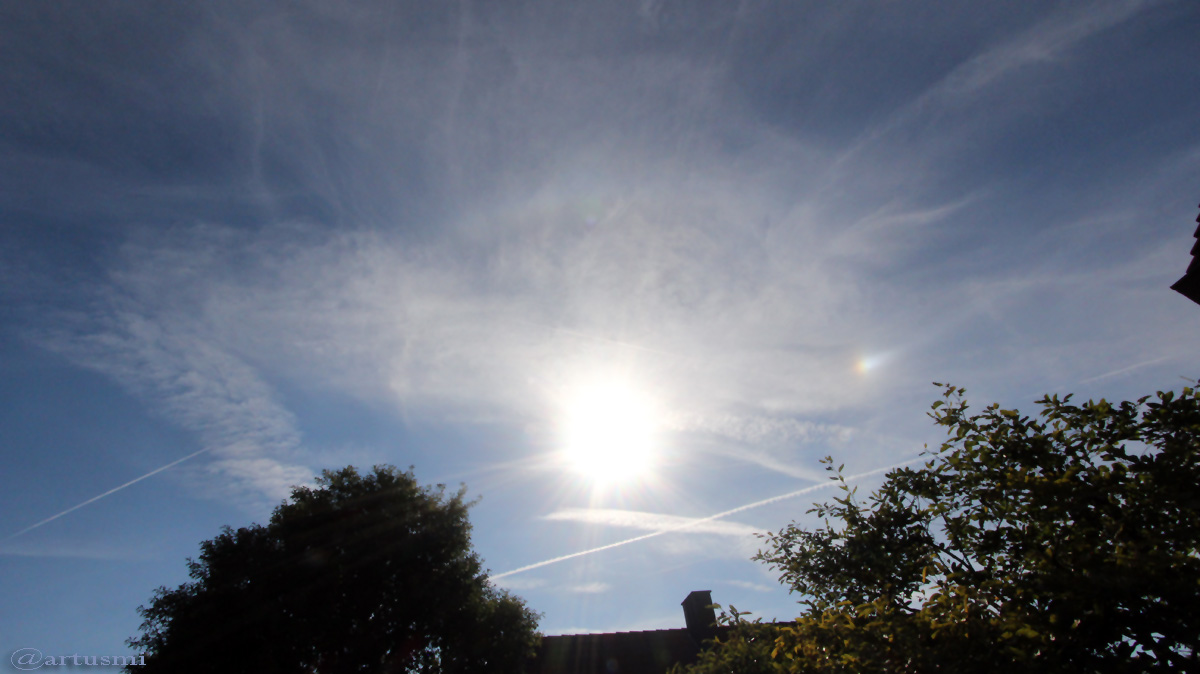 Der Himmel bot bereits am Spätnachmittag einige unserer bekannten Himmelserscheinungen. So konnten wir kurz vor 17:30 Uhr mehrere Halos um die Sonne herum sehen – Nebensonnen, einen Teil eines 22°-Ringes und eines Horizontalkreises. Zwischendurch war immer wieder einmal ein schwach ausgeprägter Zirkumzenitalbogen zu erkennen.