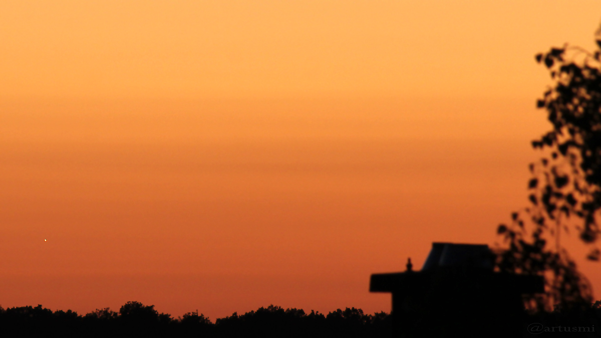 Planet Venus (-3,9 mag) im Bild links unten, 1,25° über dem Westhorizont, acht Minuten vor Untergang.