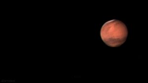 Unser ca. 1,9 mag heller Nachbarplanet hält sich unterhalb der strahlend hellen Venus und dem Stern Regulus, dem Hauptstern im Löwen, auf. Das Foto zeigt den Mars am 20. Dezember 2007 gegen 22:00 Uhr. Der Marsmond Phobos zog in dem Moment vor der Marsscheibe vorbei, was auf diesem Bild natürlich nicht zu sehen ist. Es war dies unsere erste Aufnahme vom Roten Planeten mit unserem damals neuen Teleskop. Das Bild ist das Ergebnis der Bildbearbeitung aus einem mit der WebCam über das 8-Zoll-Teleskop aufgenommenen Videos. Mars stand im Dezember 2007 in Erdnähe und war somit ein lohnendes Objekt.