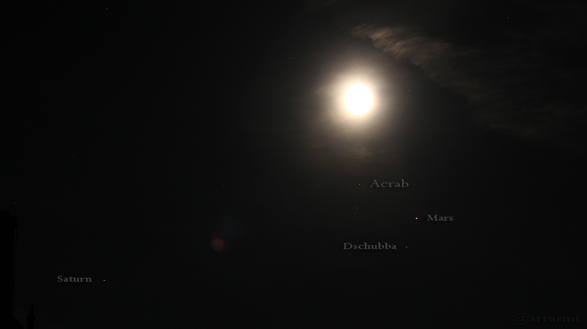 In der Nacht von Samstag auf Sonntag haben wir unseren Blick auf den Südhimmel gerichtet. Dort fiel unterhalb des Vollmondes der Rote Planet trotz der Helligkeit des Mondes recht deutlich auf. Heute Nachmittag erreicht Mars um 13:17 Uhr seine Oppositionsstellung. Das bedeutet, dass Mars, Erde und Sonne sozusagen auf einer Linie liegen.