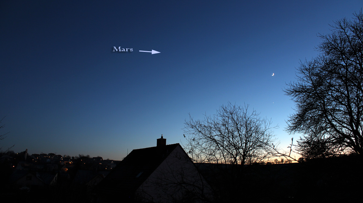 Der zu 15,3% beleuchtete Mond mit randnahem Mare Crisium stand gegen 17:00 Uhr gut 5° oberhalb der -4,2 mag hellen und rund 68% beleuchteten Venus, die gut 14° über dem Horizont zu sehen war. Der knapp 0,7 mag helle Mars stand 21° links oberhalb von Venus und Mond entfernt.