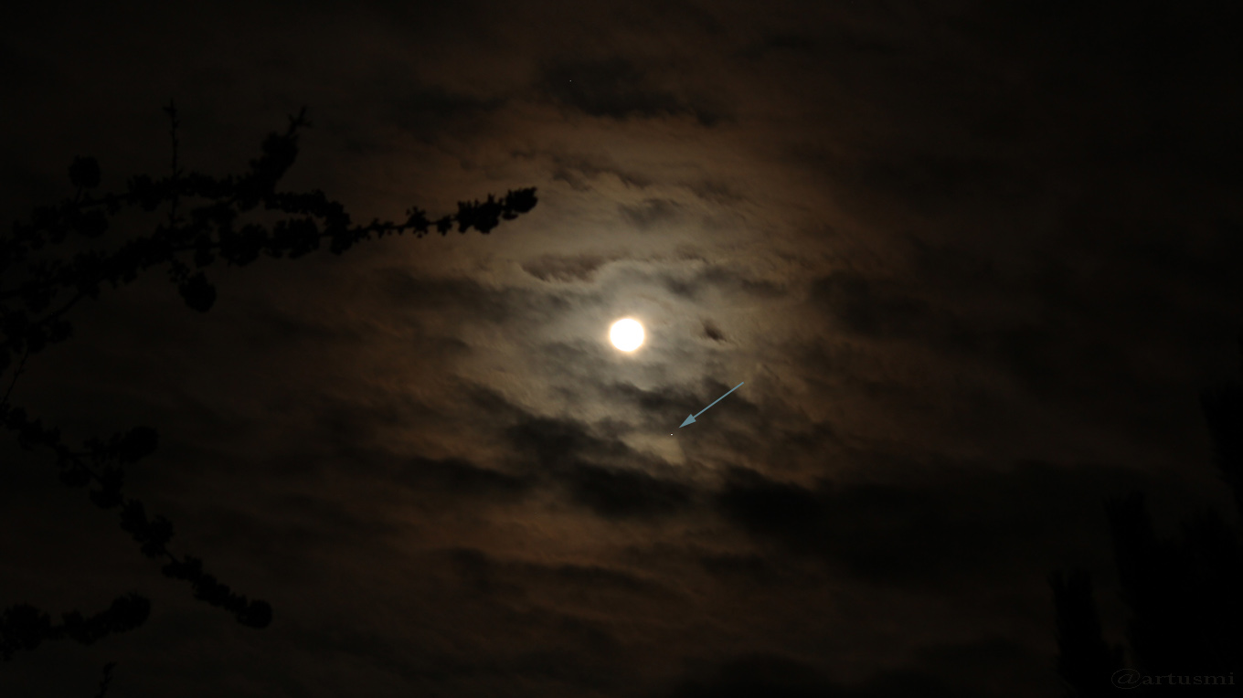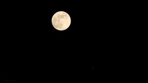 Wiederholt haben wir bei unseren Aufnahmen den Mond absichtlich überbelichtet, um die vier Galileischen Monde sichtbar zu machen. In der Reihenfolge Io, Ganymed, Europa und Kallisto (auch Callisto) sind sie rechts von Jupiter aufgereiht zu sehen, links der Konstellation auf dem Bild von 23:06 Uhr mit Stern Theta Virginis (θ Vir, θ Virginis). Auf dem Foto von 23:46 Uhr beträgt der Abstand weniger als 1,2°. Die engste Begegnung fand 30 Minuten nach Mitternacht statt. Mond und Jupiter trennten dann knapp acht Stunden vor Vollmond scheinbare 1,1° bzw. etwa zwei Vollmonddurchmesser.