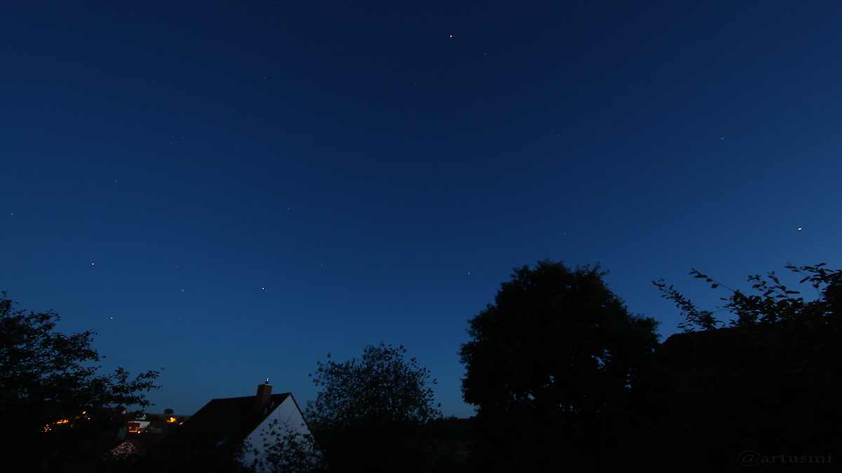 Wir haben sie uns gestern Abend am blauen, wolkenlosen Himmel angeschaut. Um sie alle drei auf ein Bild zu bekommen, mussten wir unser Superweitwinkel-Objektiv mit eingestellter Brennweite 10 mm einsetzen.