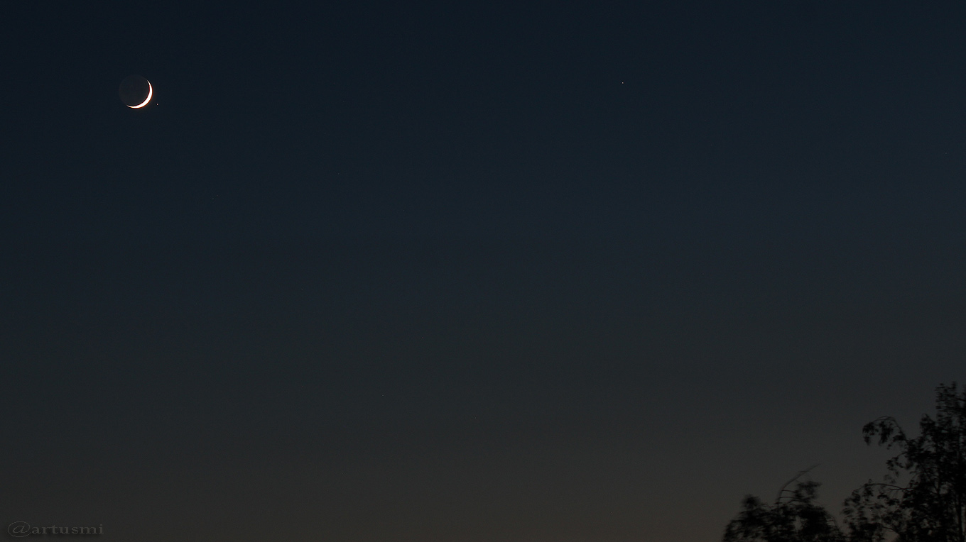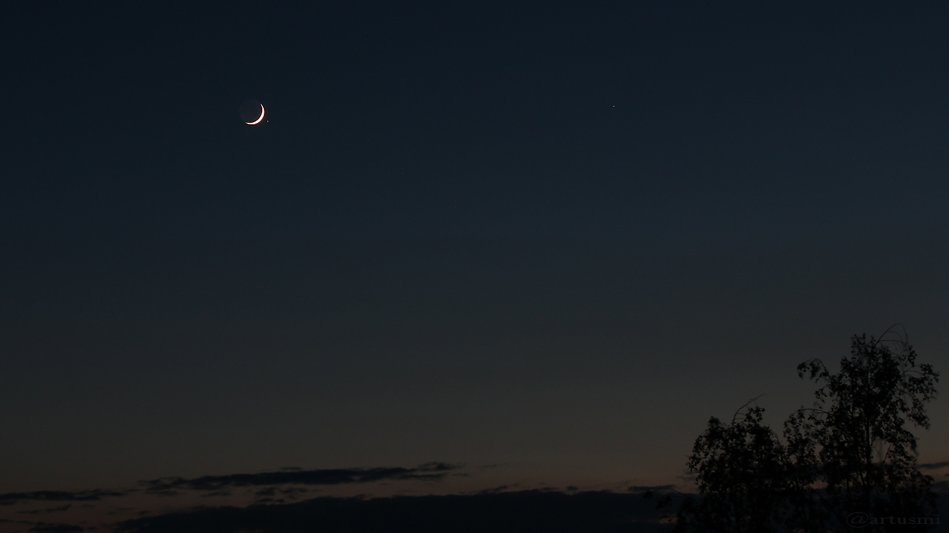 Die Grafik, die wir mit Stellarium erstellt haben, zeigt den Beginn der Bedeckung des Sterns um 20:19 Uhr am dunklen Mondrand. Die Mondsichel stand rund 24° über dem Westhorizont. Der Mond befand sich rund 358.000 Kilometer entfernt in Erdnähe, mit einem scheinbaren Durchmesser von 33,33 Bogenminuten.