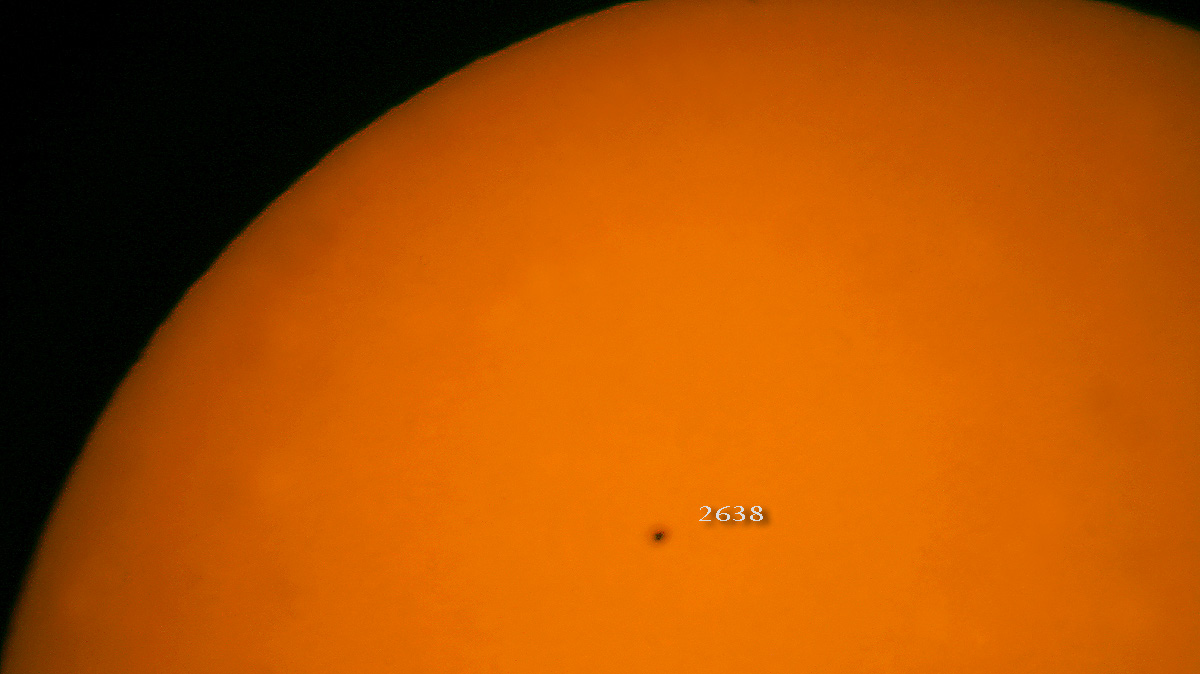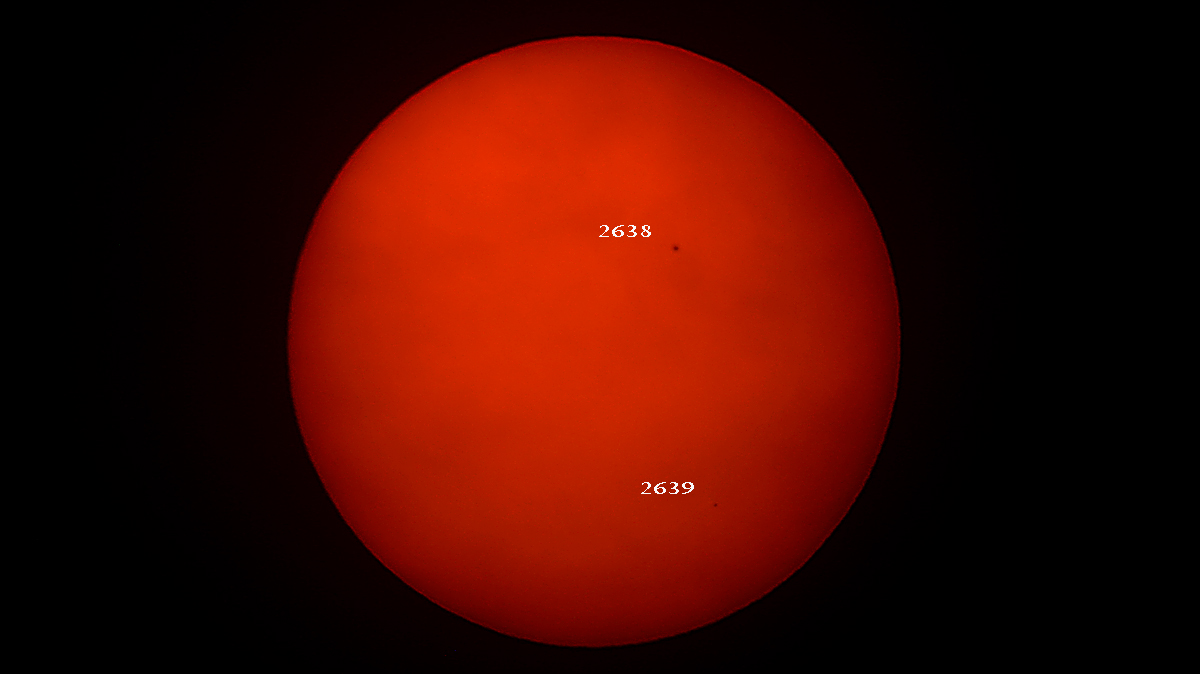 Auf der Sonne konnten wir heute Nachmittag zwei Sonnenflecken beobachten, einen größeren (AR 2638) und einen kleineren (AR 2639). AR 2638 schaut zwar auch klein aus, ist aber immer noch größer als unsere Erde. Insgesamt betrachtet, ist die Sonnenfleckenaktivität gering.