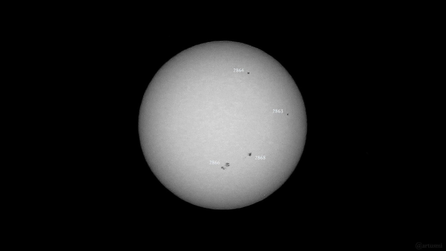 Heute, am 8. September 2021 beobachteten wir AR 2863, AR 2864, AR 2866 und AR 2868 mit und ohne Teleskop. Die Fotos haben wir mit unserer Canon 600D erst auf dem Stativ montiert und dann über unser Teleskop als Einzelbilder aufgenommen.