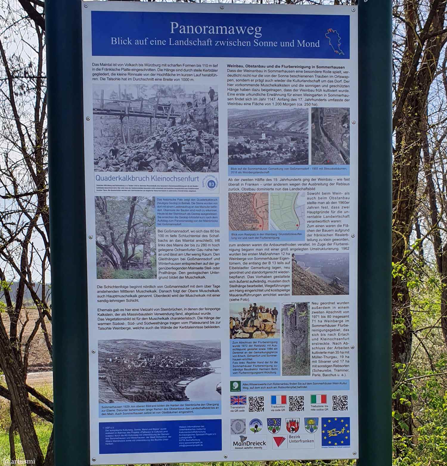 Am 12. April 2022 machten wir uns mit dem Pkw auf nach Sommerhausen. Wir stellten das Fahrzeug am Parkplatz in der Nähe des Wildparks ab und starteten unsere Wanderung unweit des Zugangs zum Panoramaweg von Sommerhausen nach Kleinochsenfurt. Über den Panoramaweg ging es vorbei am Quaderkalkbruch Kleinochsenfurt zum Sommerhäuser See und von dort aus zum Zeubelrieder Moor.
