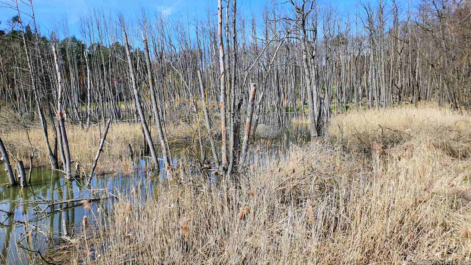 Vorbei am Quaderkalkbruch Kleinochsenfurt wanderten wir am Waldrand entlang in Richtung Sommerhäuser See. Dort angekommen stellten wir fest, dass um den See herum umfangreiche Holzfällarbeiten durchgeführt wurden, die eine Sperrung des Seegeländes bis 26. April 2022 erforderlich machten. Nach einer kurzen Verschnaufpause ließen wir den See hinter uns und bewegten uns entlang des Rappertsmühlbachs über einen Feldweg zum Zeubelrieder Moor, das wir nach einer knappen Viertelstunde erreichten.
